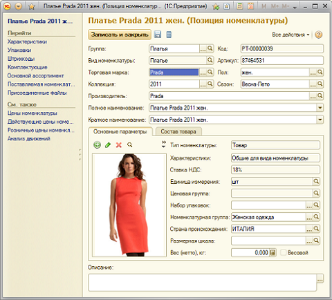 Особенностью учета в программе является возможность присвоения товару признаков, таких как: размер, цвет, длина, высота и т.д.
